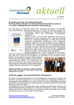 Der Förderpreis 2014 vom Förderkreis Innungsbetriebe Handwerk e.V. wurde am Montag, den 17.11.2014, in einer Feierstunde für die "GenerationenWerkstatt" an die Firma Röwer, Gebäude- und Sicherheitstechnik Osnabrück, verliehen.